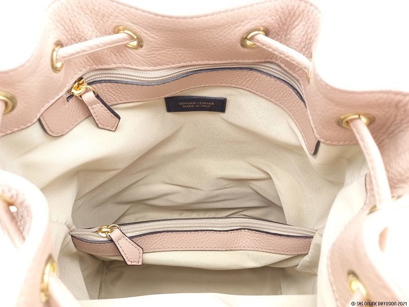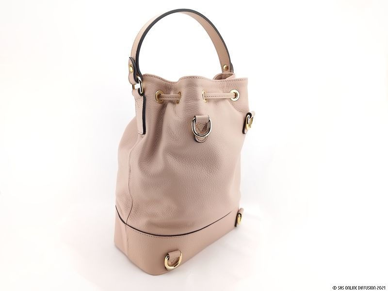 En enlevant les bretelles amovibles, le sac à dos devient un magnifique sac seau à porter à la main par la anse. Les accessoires en métal doré le réhaussent avec éclat.
